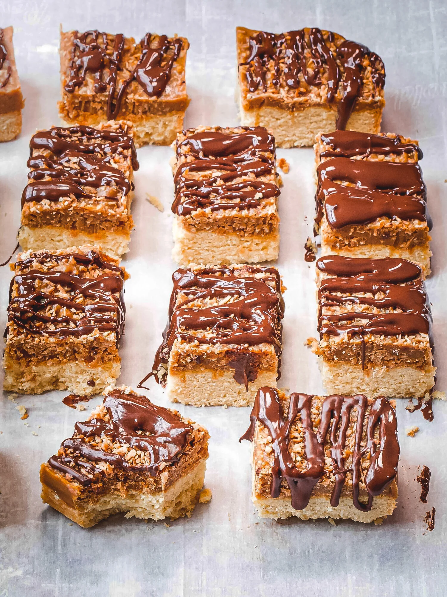 Another tip for this recipe is that to give these bars the traditional Samoa cookie look, take the time to dip the bottoms of the bars in the chocolate and then stick them back in the fridge to chill. This will help you achieve that classic look.